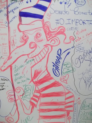 Ele ficou bem atordoado com as garotas bonitas que ja´saem cumprimentando com beijos e abraços. Não tá acostumado com isso. A cartunista Pomba Claudia viu que ele era tímido e apatifou bastante com ele, ahahhahahahal… Ele adorou ela.