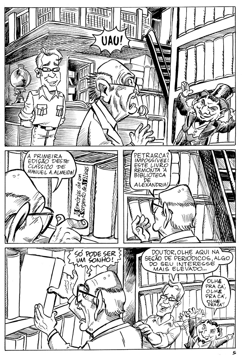 “Esta arte fenomenal é do Bira Dantas, que está desenhando uma história chamada O Primeiro da Fila pra mim. A HQ poderá ser lida integralmente na revista que estou programando para abril. Esta página é só pra dar um gostinho.”