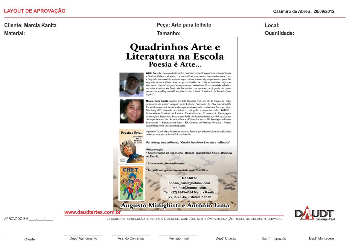 “Caminhos da Leitura” (Feira do Livro de Casimiro de Abreu) aconteceu em agosto de 2012, em Barra de São João. O Projeto de Leitura “Quadrinhos e Literatura na Escola” contou com Wilde, Antonio Lima, Augusto Minighitti e Marcia Kanitz.