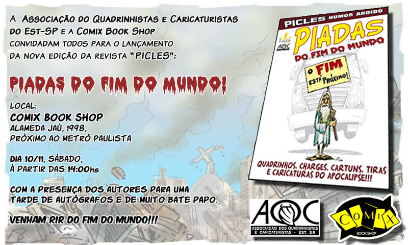 O lançamento da revista “Piadas do Fim do Mundo!” (“Picles” #02) será realizado na livraria Comix Book Shop no dia 10/11, sábado, a partir das 14hs, na Alameda Jaú, 1998, próximo ao metrô Paulista, com a presença dos autores para uma tarde de autógrafos e de muito bate papo.