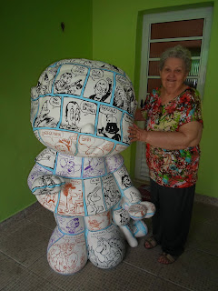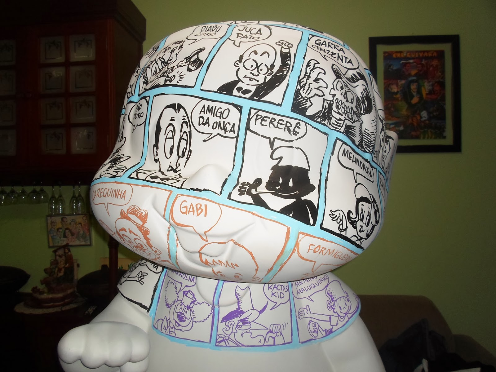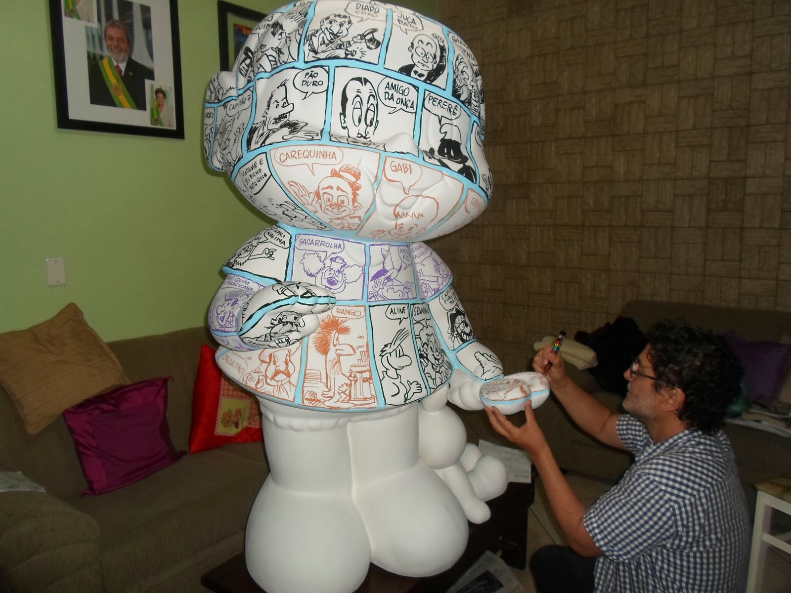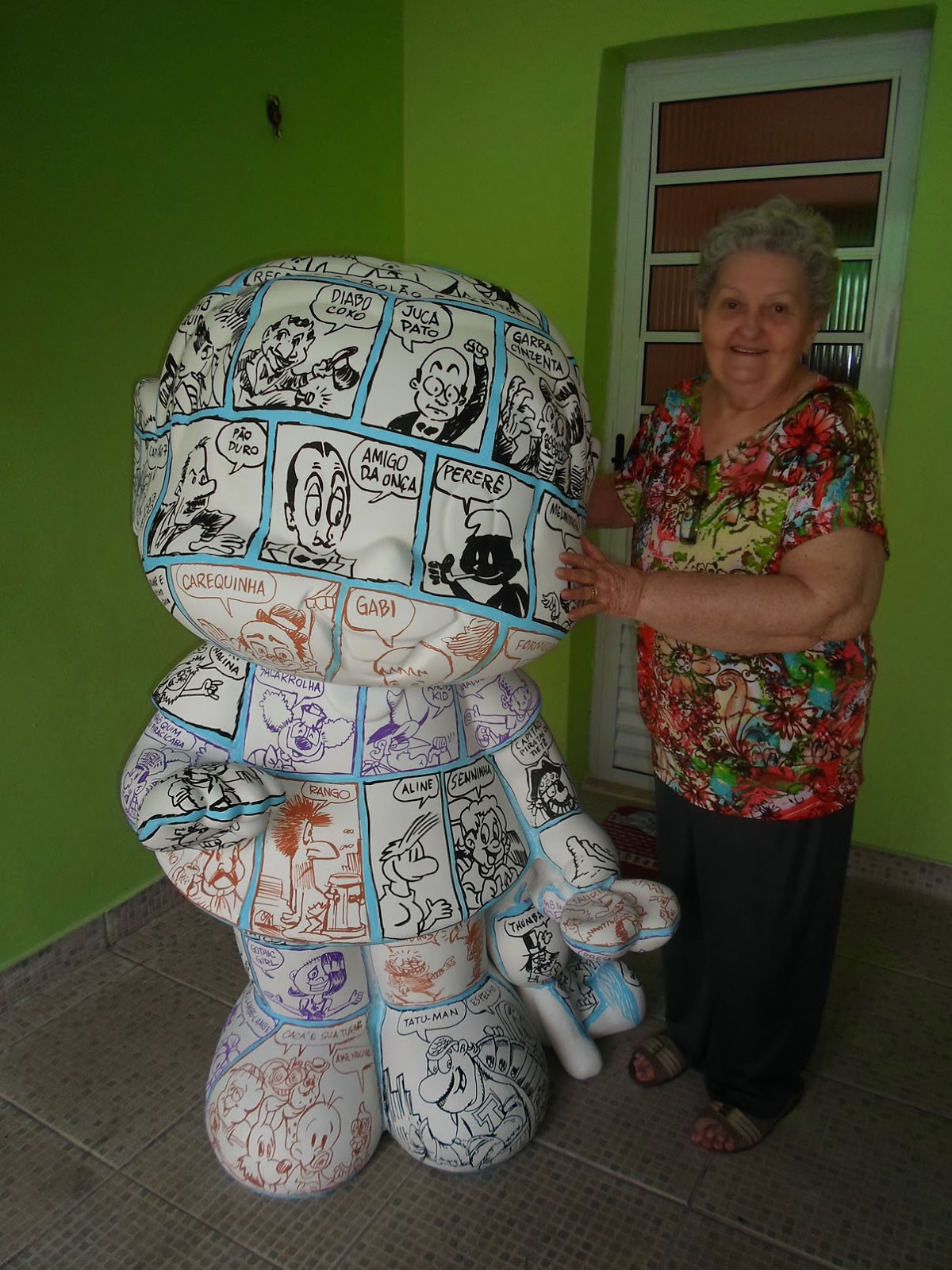 “Levei 18 horas de trabalho durante dois dias. Usei canetas Posca para desenhar direto na escultura, sem esboço, exceto pelos estudos prévios que tinha feito. A única ajuda que tive foi de minha mãe, D. Lourdinha, que guardou a escultura em sua casa e me ajudou a pintar os azuis entre os requadros.”