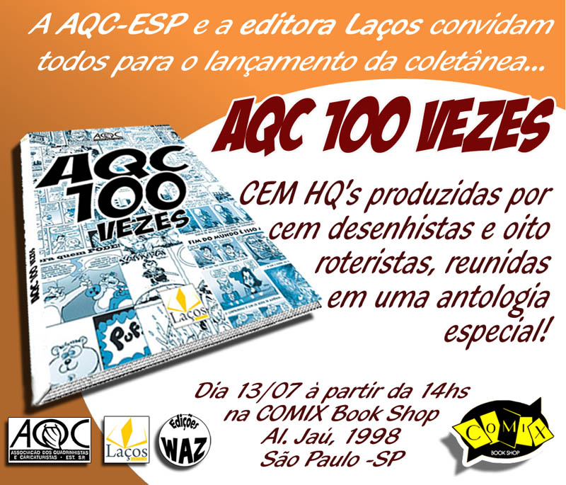 Saiu o livro “100 Vezes AQC”, que reúne 100 histórias em quadrinhos de uma página cada de oito roteiristas e 100 desenhistas. Realizado pela Associação de Quadrinhistas e Caricaturistas do Estado de São Paulo (AQC-ESP) e pela editora Laços, a publicação apresenta um panorama abrangente da arte quadrinhizada. Com temas, motivações, inspirações, influências e traços diferentes, “100 Vezes AQC” é uma seleção inédita que abarca autores consagrados, profissionais habilidosos e jovens promessas. Agregando doses certas de humor, aventura, ficção, terror, fantasia, drama, poesia, experimentalismo, imaginação e muito talento.