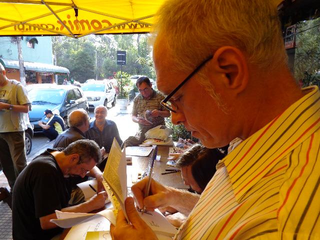 A grande festa teve a presença de 32 autores e segundo o Jorge (proprietário da Comix), estiveram lá 650 pessoas. Uma parte convidada dos quadrinhistas ou que soube do lançamento pela internet… Mas mesmo os que foram na loja pela promoção, uma boa parte acabou comprando o livro! O livro está à venda na página da Comix Book Shop. http://www.comix.com.br/